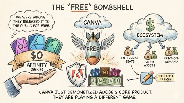 Canva just demonetized Adobe’s core product. They are playing a different game. Canva makes money on the “ecosystem” (enterprise seats, stock assets, print-on-demand). They don’t need to charge you for the pencil.