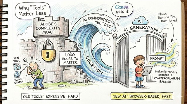 AI destroyed that moat. If a 12-year-old can generate a commercial-grade banner in 10 seconds on a browser, who needs a $60/month subscription for a tool that takes 5 years to master?