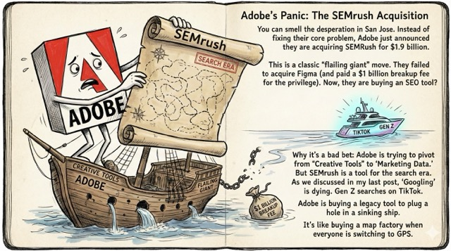 Why it’s a bad bet: Adobe is trying to pivot from “Creative Tools” to “Marketing Data.” But SEMrush is a tool for the search era. As we discussed in my last post, “Googling” is dying. Gen Z searches on TikTok.