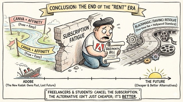 My Prediction: Adobe won’t disappear overnight. They are entrenched in the corporate workflow. But they are the new Kodak. They own the past, but they just lost the future.