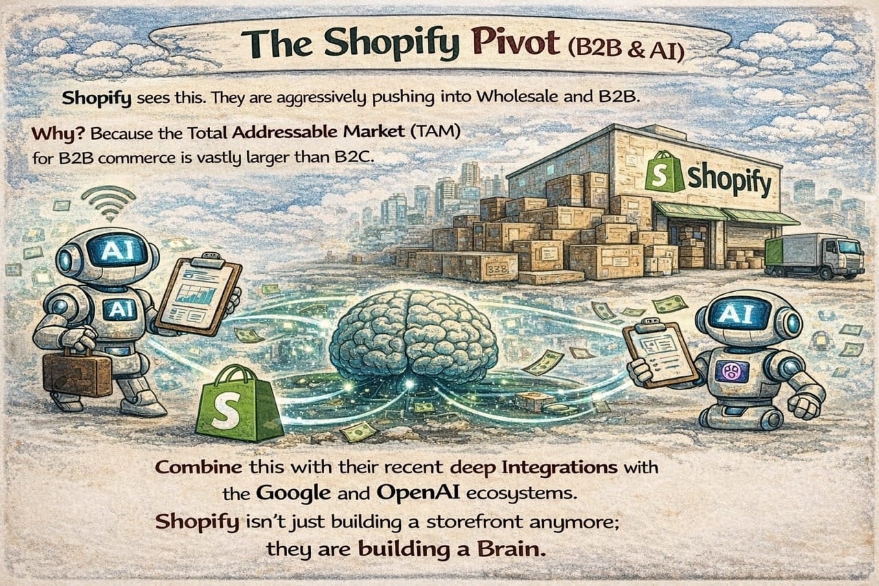 Shopify is aggressively pushing into B2B. Combined with the new OpenAI ecosystem, they are building the infrastructure to replace the "Merchant" with a "Model."