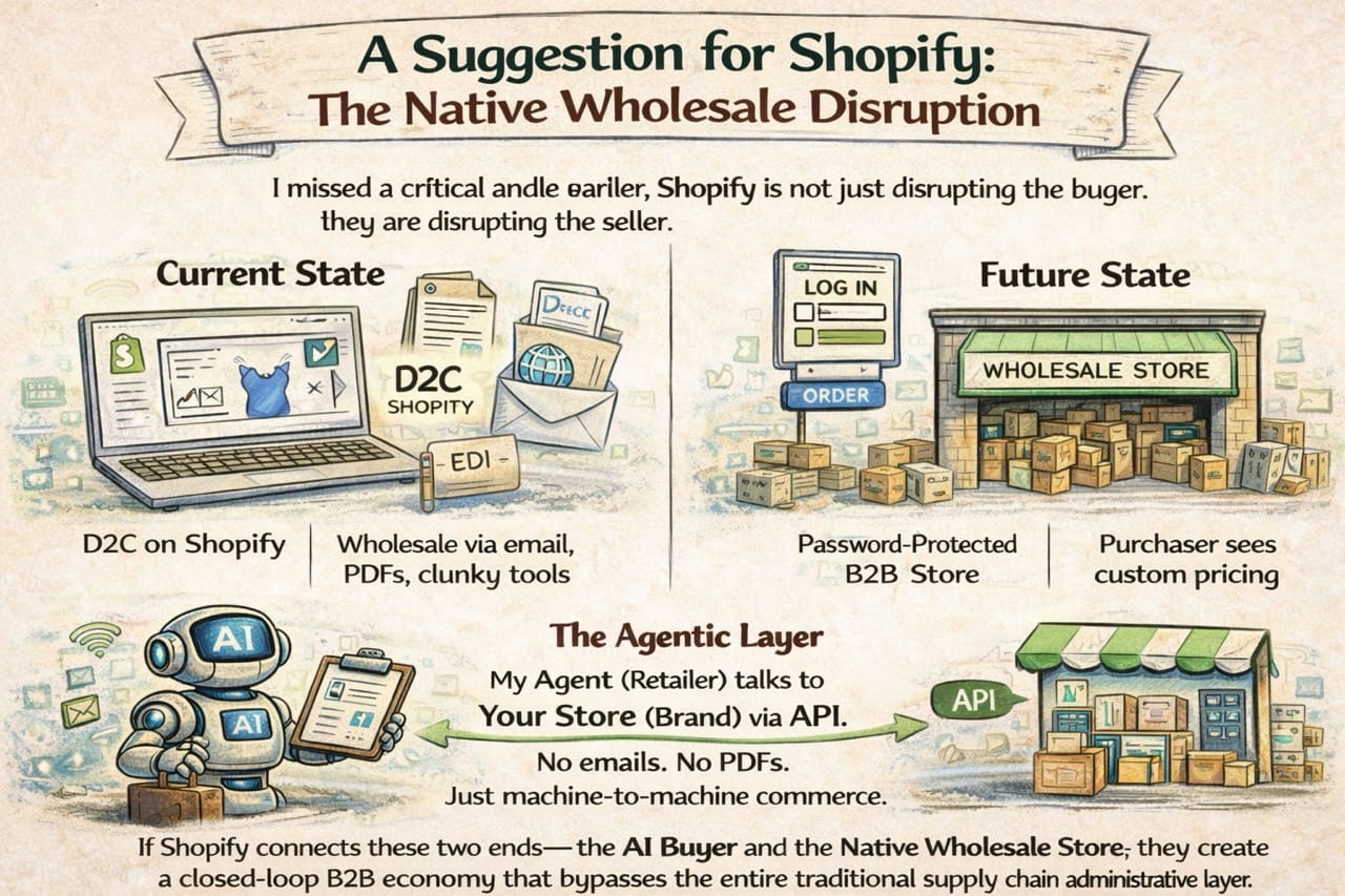 If Shopify connects these two ends—the AI Buyer and the Native Wholesale Store—they create a closed-loop B2B economy that bypasses the entire traditional supply chain administrative layer.