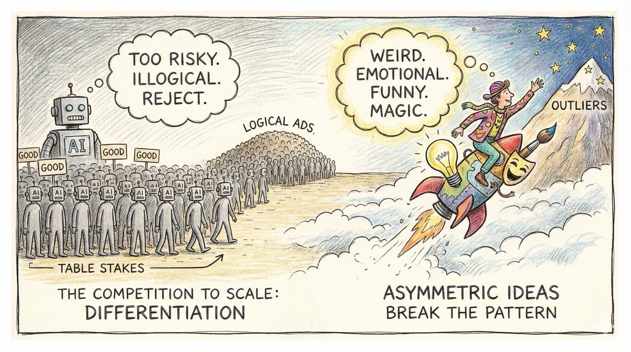 To scale past the noise, you need Asymmetric Ideas. You need the idea that an AI would reject because it’s "too risky" or "illogical." As Rory Sutherland argues in Alchemy, the magic happens in the outliers.