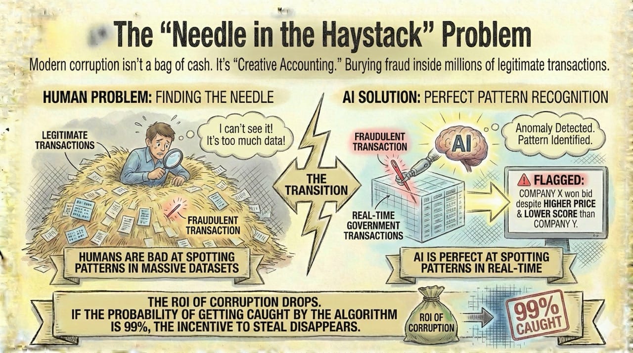 Corruption relies on obscurity. AI is a universal auditor that reads every contract, tracks every cent, and never sleeps.