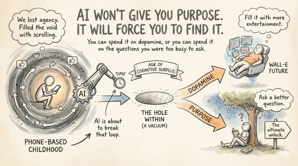 If you don’t have a purpose, that extra time is a curse. You will fill it with more entertainment (the WALL-E future). But for the curious, it is the ultimate unlock.