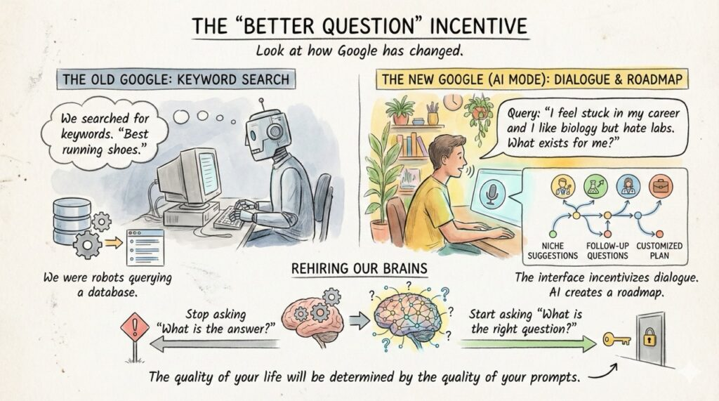 The Old Google: We searched for keywords. “Best running shoes.” We were robots querying a database. The New Google (AI Mode): The interface incentivizes dialogue.