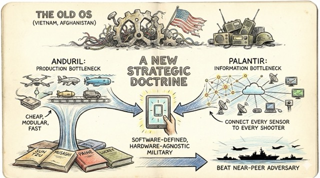 Anduril solves the production bottleneck (building cheap, modular weapons fast). Palantir solves the information bottleneck (connecting every sensor to every shooter instantly).