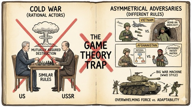 Game theory works great when both sides are rational actors playing by similar rules. This was the Cold War (Mutually Assured Destruction).