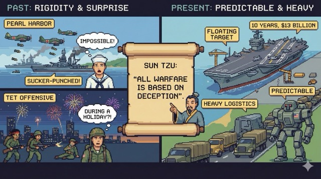 We forgot this. We became predictable. We built massive aircraft carriers (floating targets) that take 10 years to build and cost $13 billion. We lost the element of surprise because our logistics were too heavy to hide.