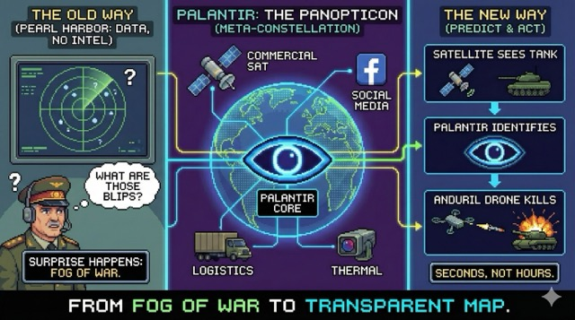 By integrating all data sources (satellites, social media, logistics, thermal), Palantir moves the US from reacting to surprise to predicting it. It turns the “Fog of War” into a transparent map.