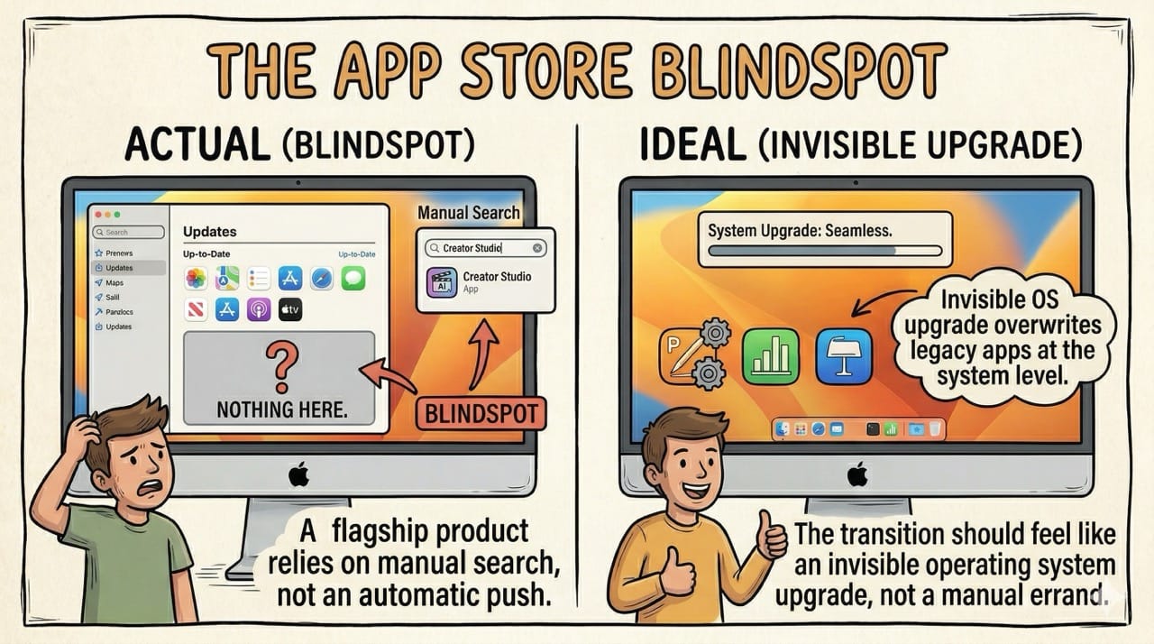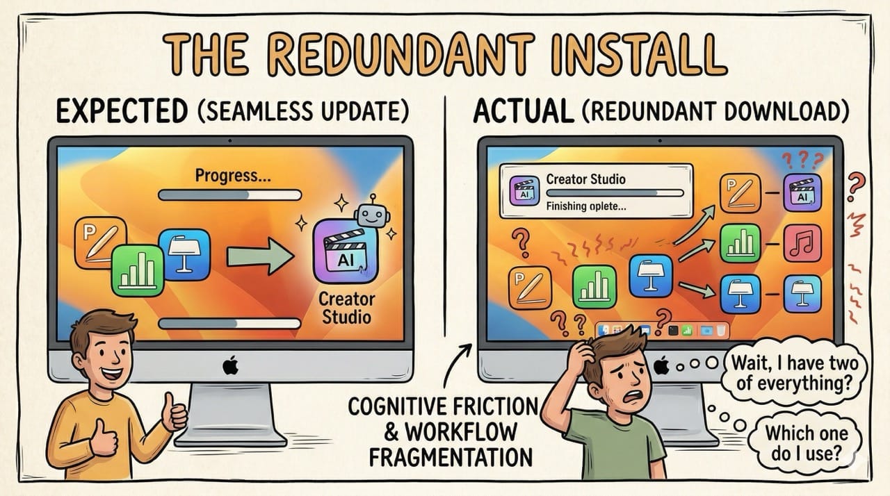 Inspiration: Analyzing the confusing rollout of Apple Creator Studio. Realizing that forcing users to download a brand new application instead of seamlessly updating legacy software creates massive adoption friction.