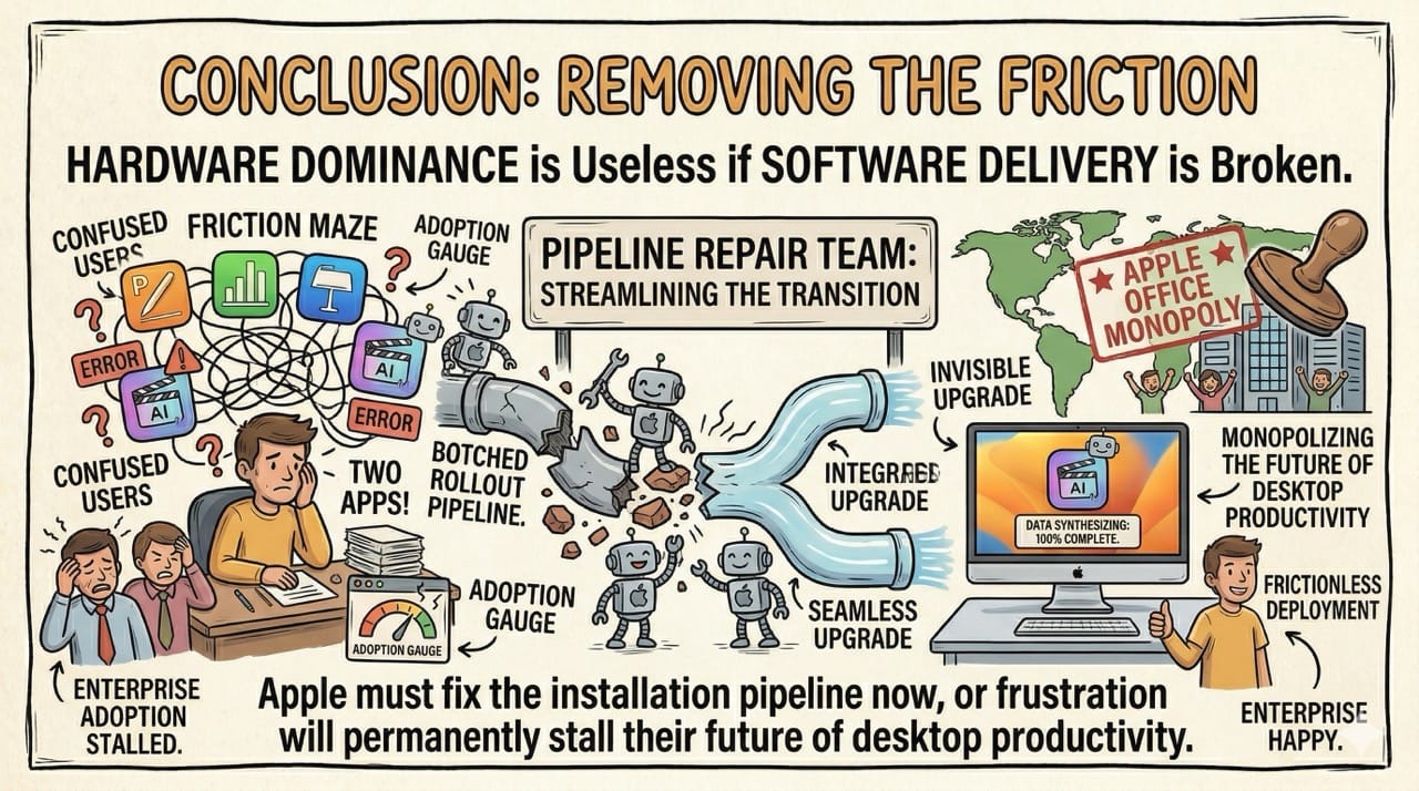 Apple finally built a suite of productivity tools powerful enough to dethrone Microsoft Office. Unfortunately, a deeply flawed software deployment strategy is suffocating their massive artificial intelligence advantage.