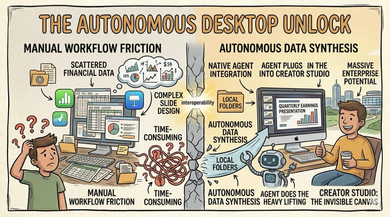 The agent would open Creator Studio, pull the necessary financial data from local folders, and design the slides entirely in the background.