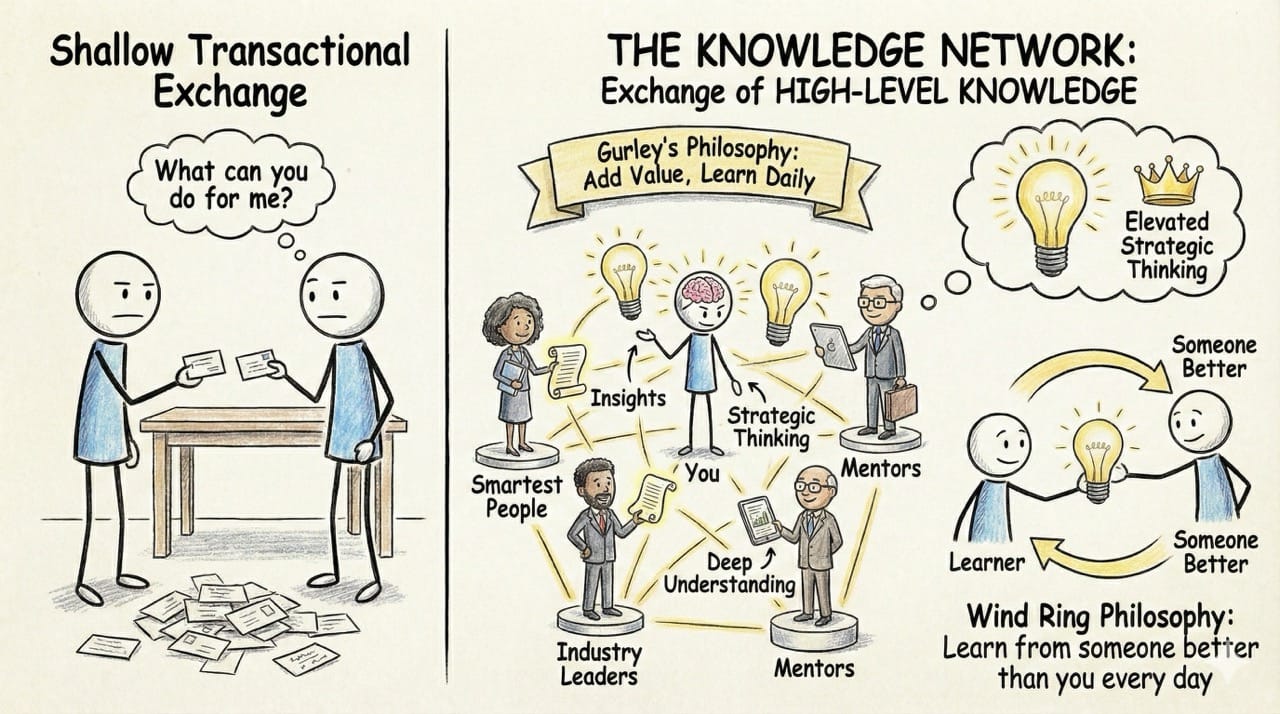 He advises building a network based entirely on the mutual exchange of high-level knowledge.