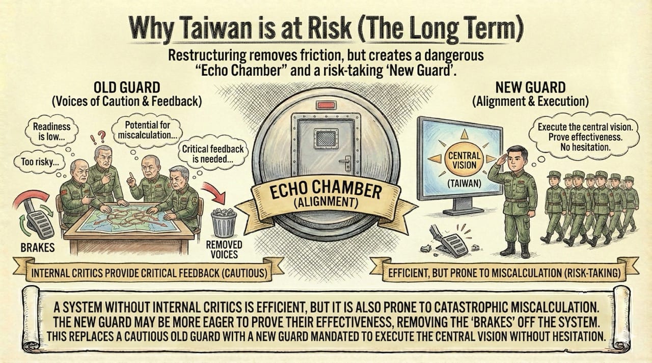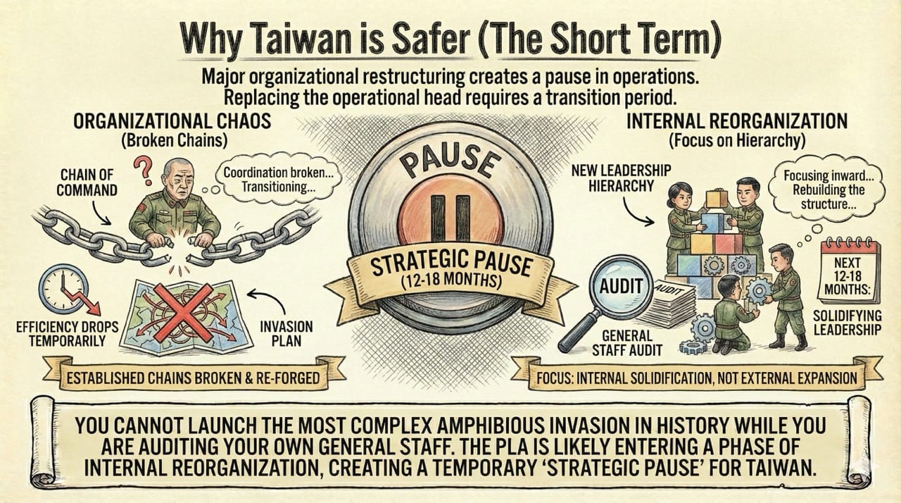 The "Strategic Pause": The PLA is likely entering a phase of internal reorganization. For the next 12 to 18 months, the focus will be on solidifying the new leadership hierarchy rather than external expansion. You cannot launch the most complex amphibious invasion in history while you are auditing your own general staff.