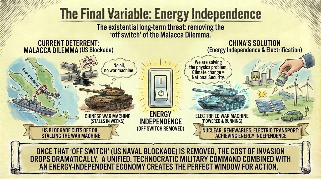 Once that "off switch" is removed, the cost of invasion drops dramatically. A unified, technocratic military command combined with an energy-independent economy creates the perfect window for action.