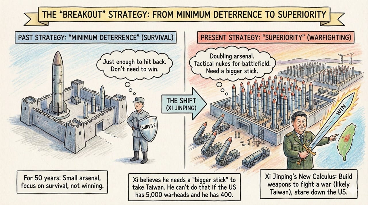 For 50 years, China’s strategy was simple: have just enough nukes to ensure that if the US attacked, China could hit back. They didn't need to win; they just needed to survive.
