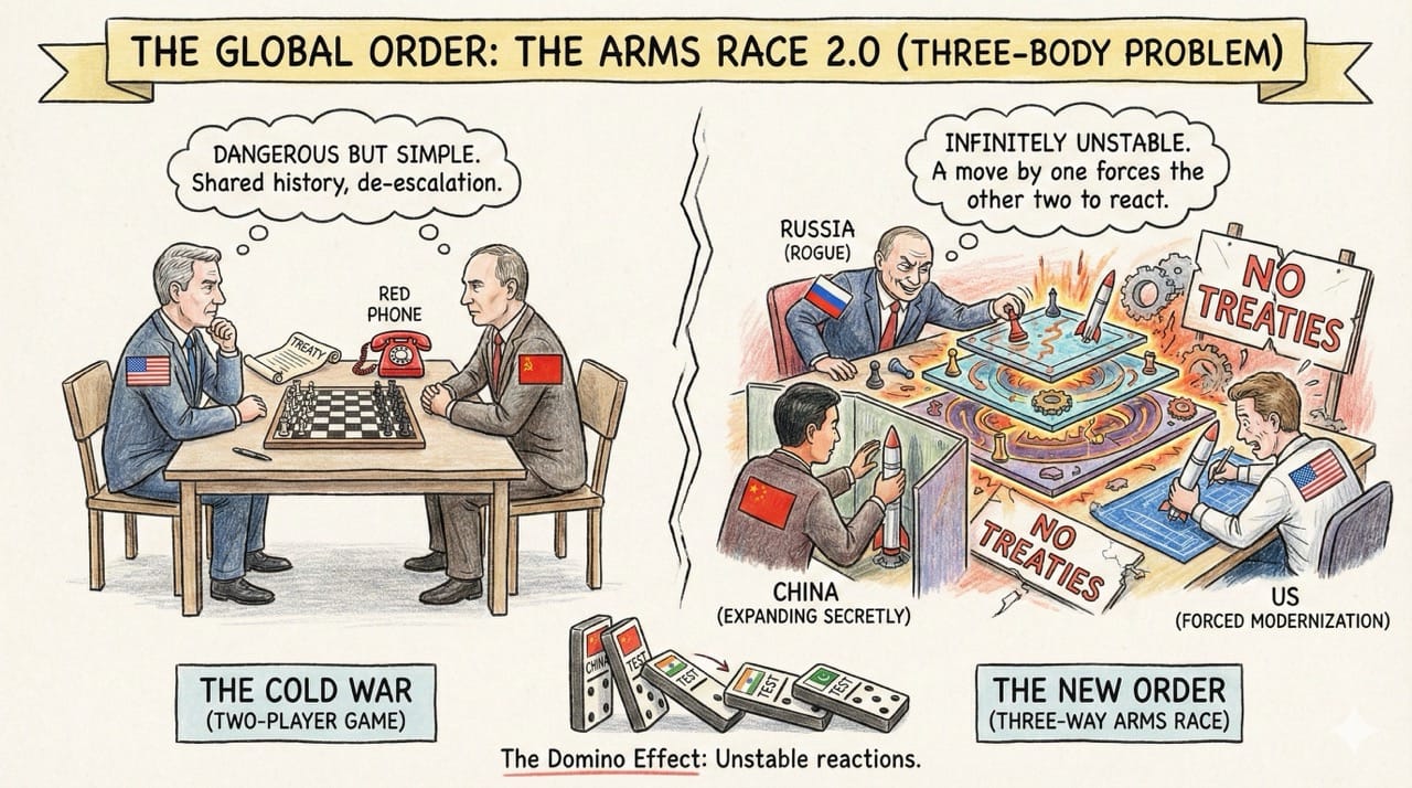 This is infinitely more unstable. There are no treaties governing this triad. A move by one forces the other two to react. If China tests, India will feel compelled to test. If India tests, Pakistan tests. The dominoes are lined up.