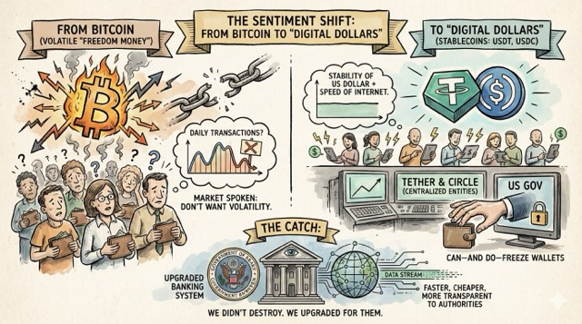 The market has spoken. People don’t want volatile “freedom money” (Bitcoin) for daily transactions. They want Stablecoins (USDT, USDC).