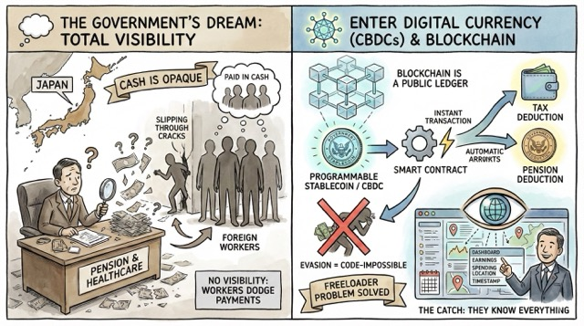 Japan struggles with foreign workers dodging mandatory pension and national healthcare payments. Because many are paid in cash or through fragmented banking systems, the government has zero visibility. They slip through the cracks.