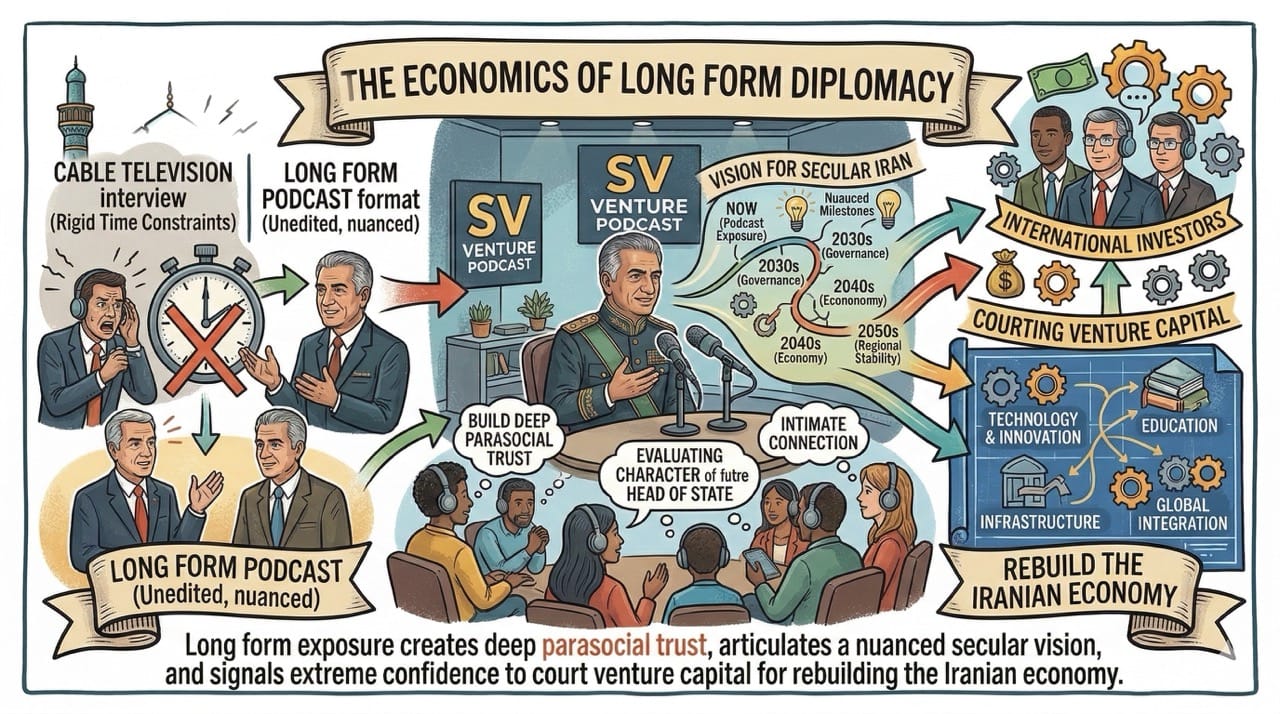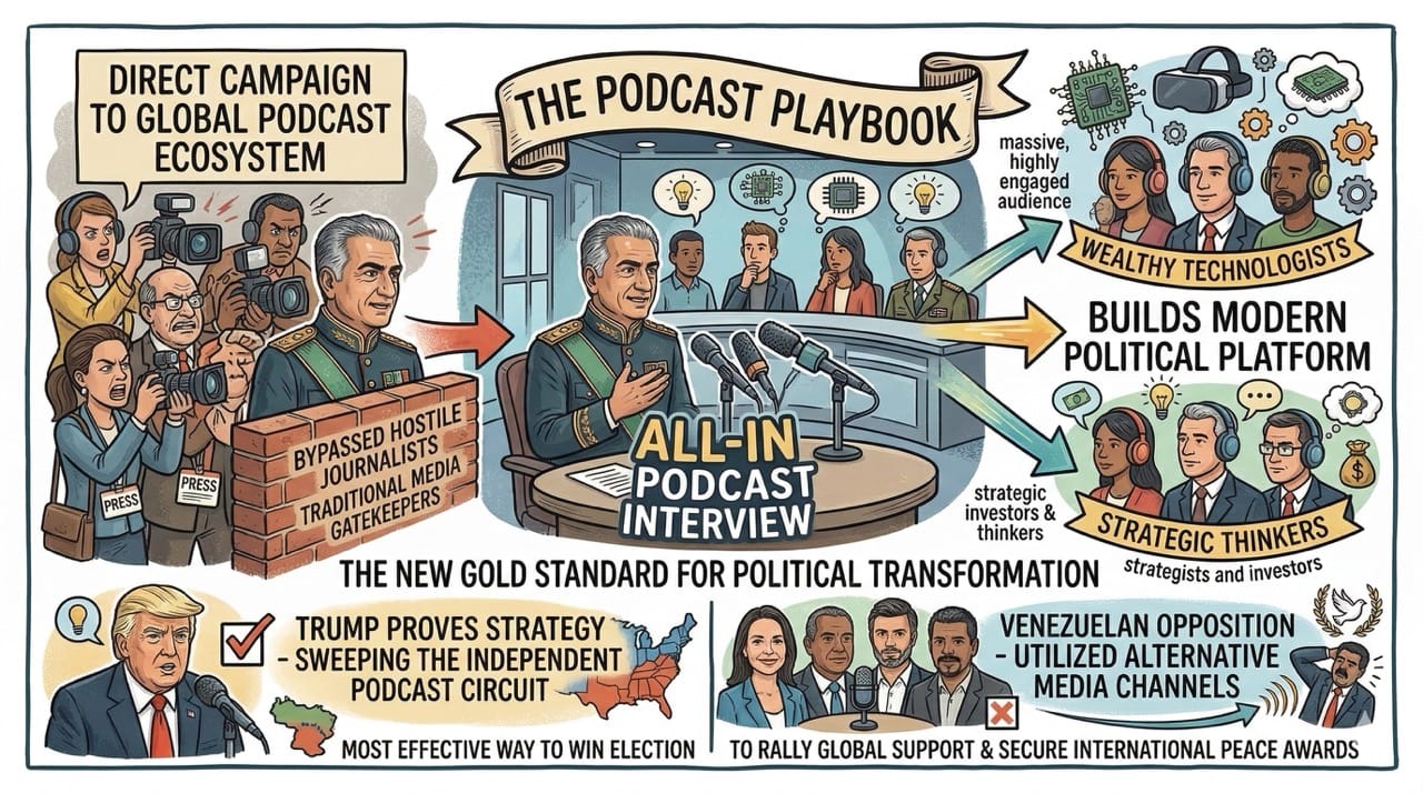 Inspiration: Watching Reza Pahlavi's recent appearance on the All-In Podcast. Realizing that the modern playbook for regime change and political transformation relies heavily on the unregulated reach of the podcast ecosystem.