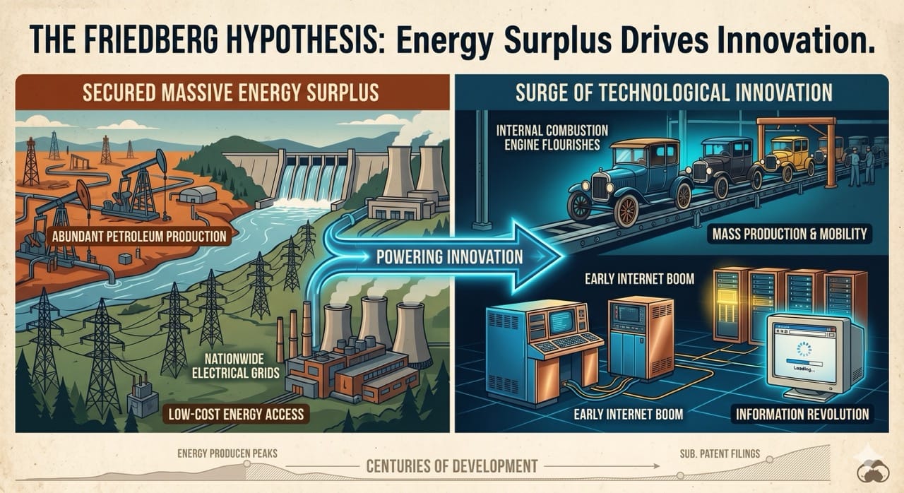David Friedberg recently noted that technological innovation typically surges only after a society secures a massive surplus of cheap energy.
