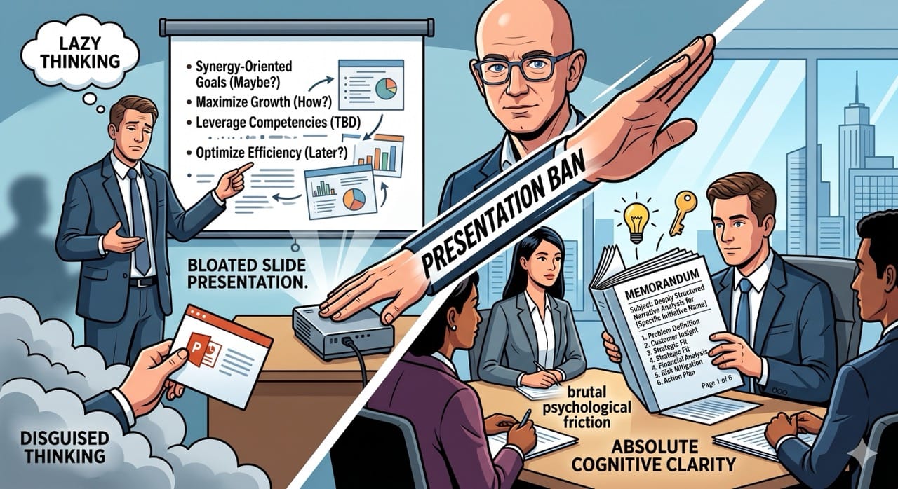 Bezos famously banned these presentations entirely and forced his executives to write deeply structured six page narrative memos.