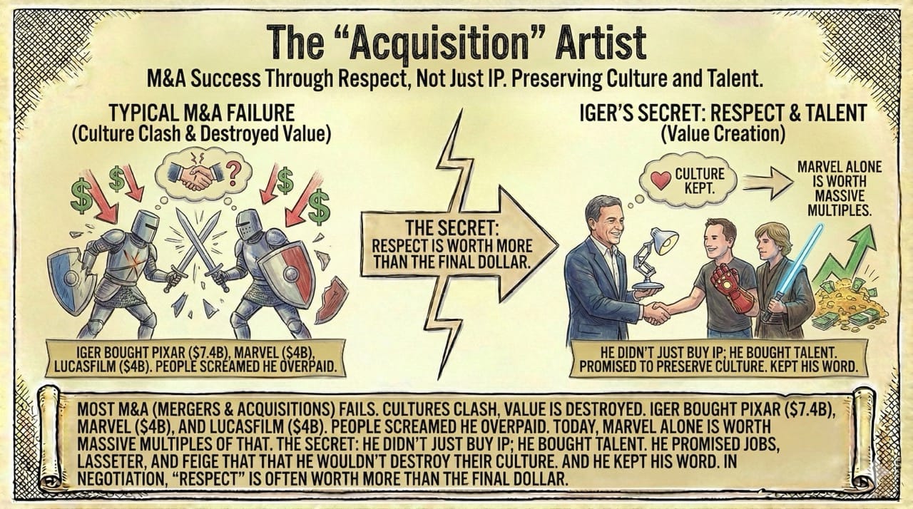 The Secret: He didn't just buy IP; he bought Talent. He promised Jobs, Lasseter, and Feige that he wouldn't destroy their culture. And he kept his word. In negotiation, "Respect" is often worth more than the final dollar.