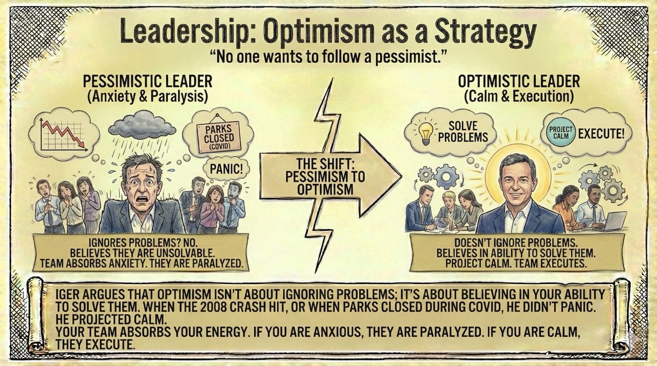 Iger argues that optimism isn't about ignoring problems; it’s about believing in your ability to solve them.