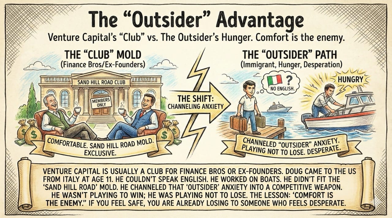 Doug came to the US from Italy at age 11. He couldn't speak English. He worked on boats. He didn't fit the "Sand Hill Road" mold.