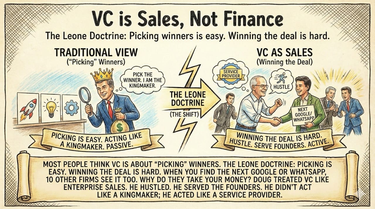 Doug treated VC like enterprise sales. He hustled. He served the founders. He didn't act like a kingmaker; he acted like a service provider.