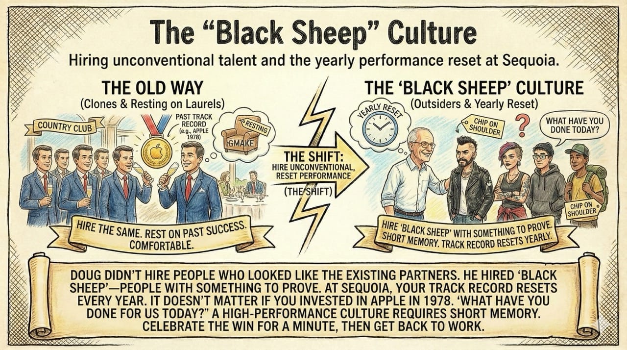 Doug didn't hire people who looked like the existing partners. He hired "Black Sheep"—people with something to prove.
