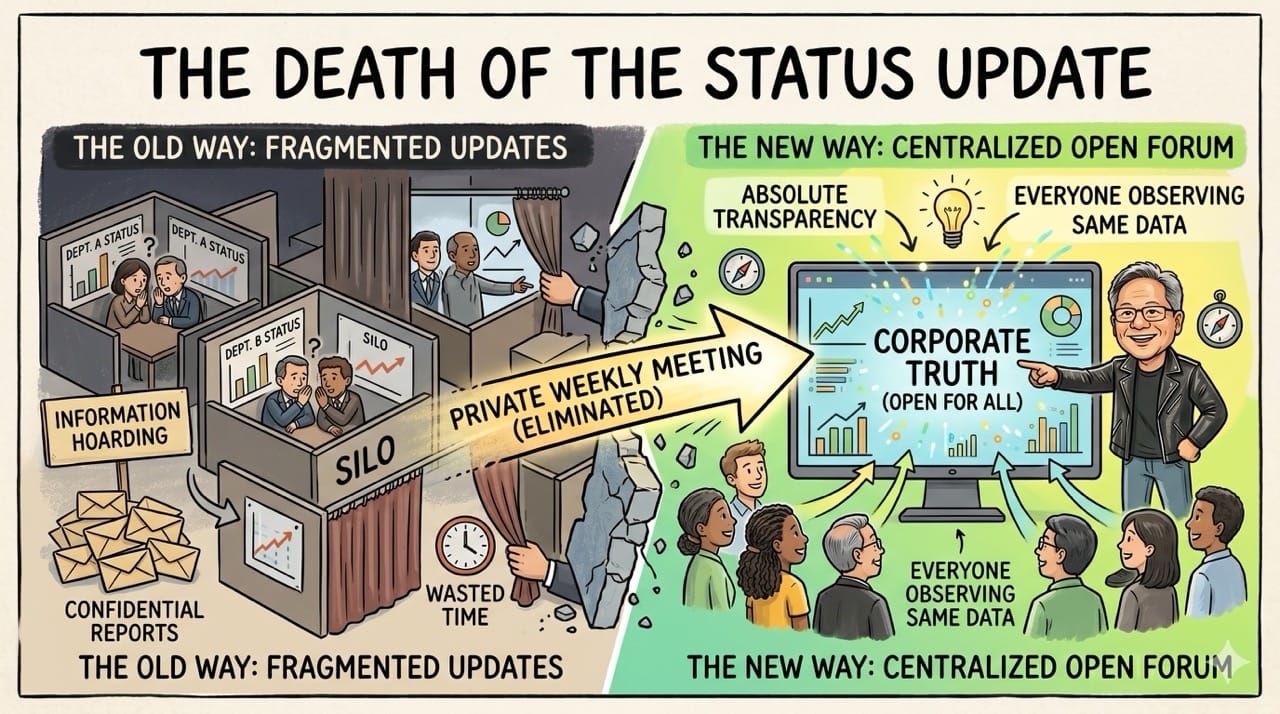 Legacy executives rely on isolated status meetings to hoard valuable information. The architect of the artificial intelligence revolution forces absolute transparency by flattening the entire organizational chart.