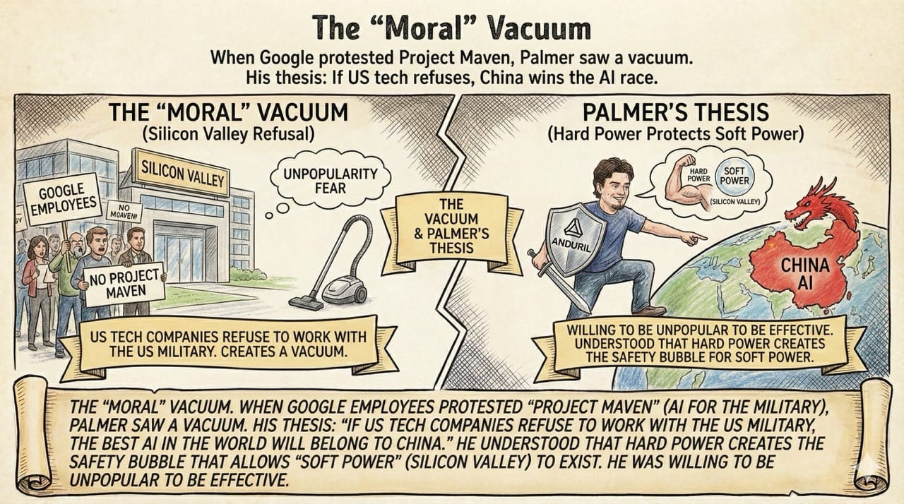 When Google employees protested "Project Maven" (AI for the military), Palmer saw a vacuum.