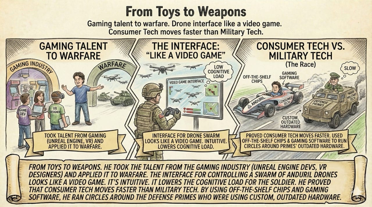 He took the talent from the gaming industry (Unreal Engine devs, VR designers) and applied it to warfare.