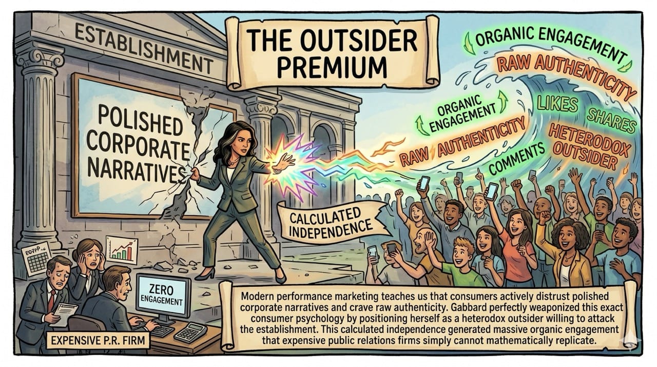 Gabbard perfectly weaponized this exact consumer psychology by positioning herself as a heterodox outsider willing to attack the establishment.