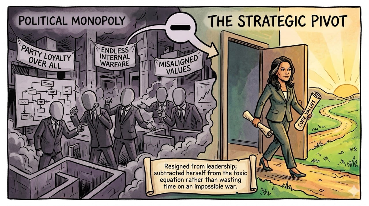 Inspiration: Analyzing the unprecedented political trajectory of Tulsi Gabbard for the Effective Executive series. Realizing that walking away from a massive legacy institution is often the absolute fastest way to accumulate genuine operational leverage.