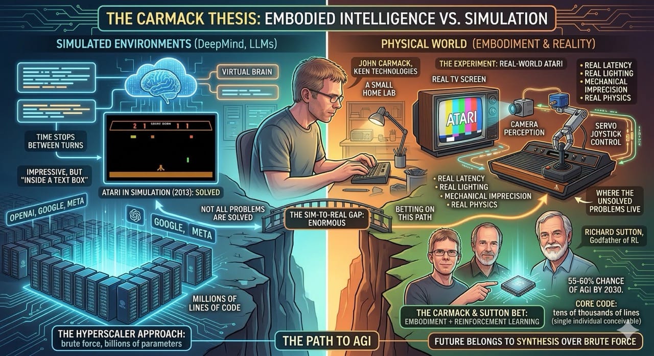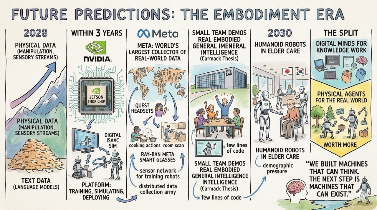 A small team will demo real embodied general intelligence before a big lab does. Carmack's thesis is not just optimism. It reflects a genuine architectural insight about how few lines of code the core might require.