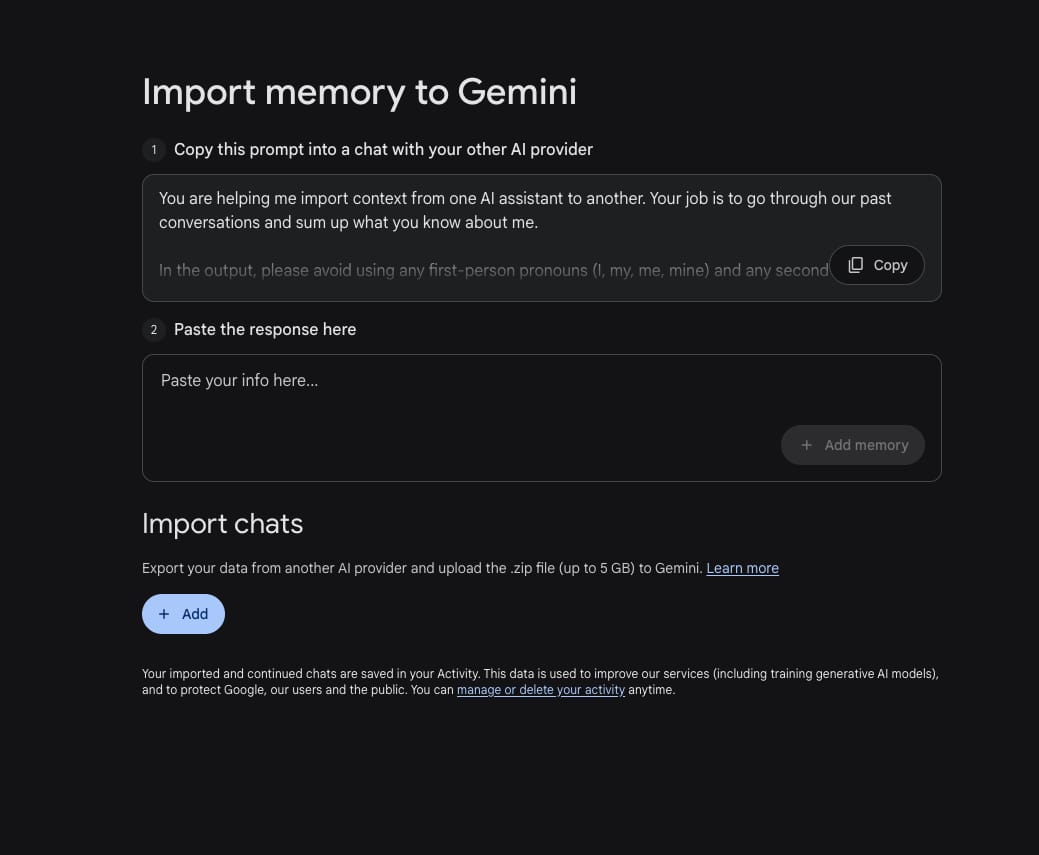 Users can export their data from another AI provider and upload a zip file up to five gigabytes directly into Gemini.