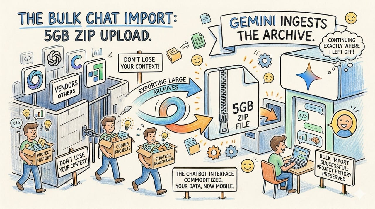 Gemini simply ingests the zip file and continues the conversation exactly where the competitor left off. It completely commoditizes the basic chatbot interface.