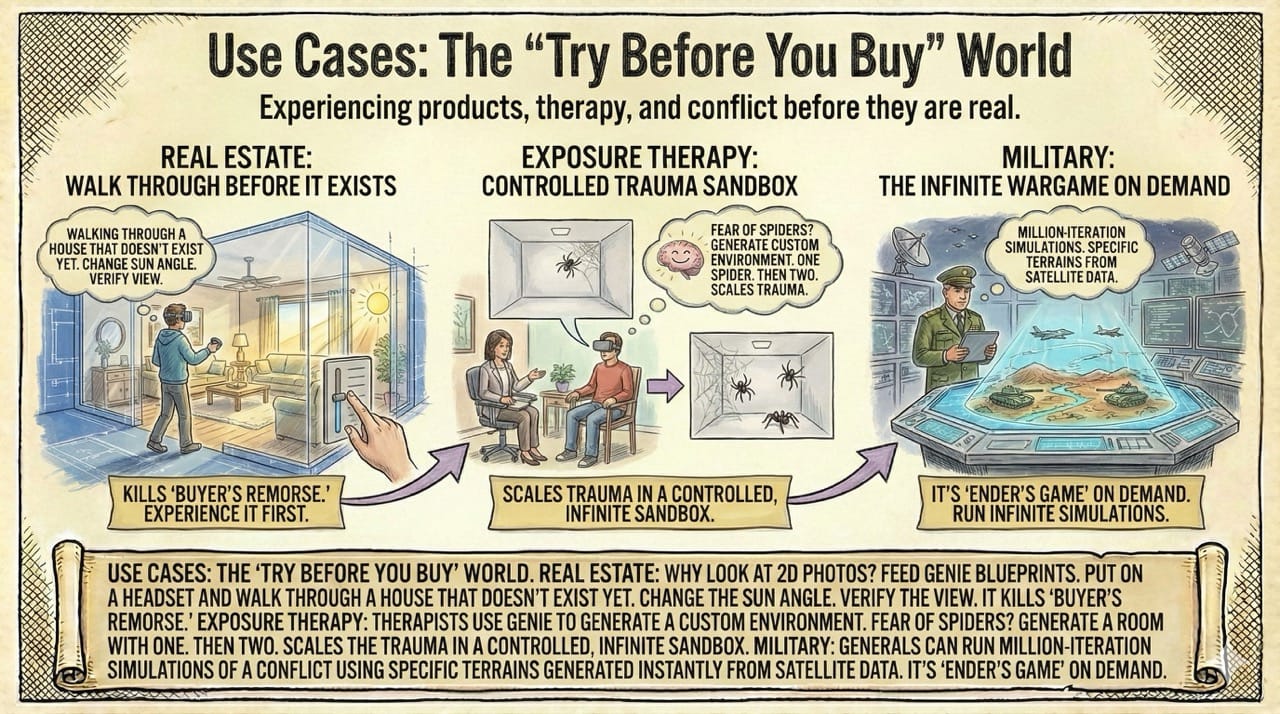 Real Estate: Why look at 2D photos? You feed Genie the blueprints of a house that doesn't exist yet. You put on a headset and walk through it. You change the sun angle. You verify the view. It kills "Buyer's Remorse."