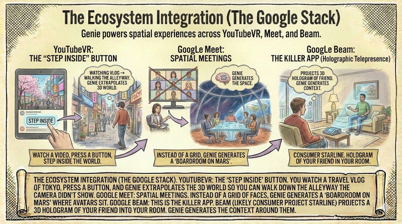 Google Meet: Spatial meetings. Instead of a grid of faces, Genie generates a "Boardroom on Mars" where avatars sit.