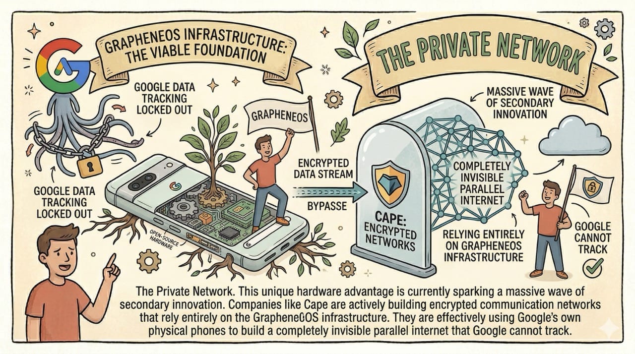 Companies like Cape are actively building encrypted communication networks that rely entirely on the GrapheneOS infrastructure.