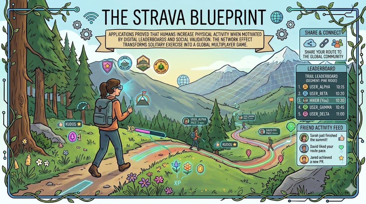 Applications like Strava successfully proved that humans will dramatically increase their physical activity when motivated by digital leaderboards and social validation.