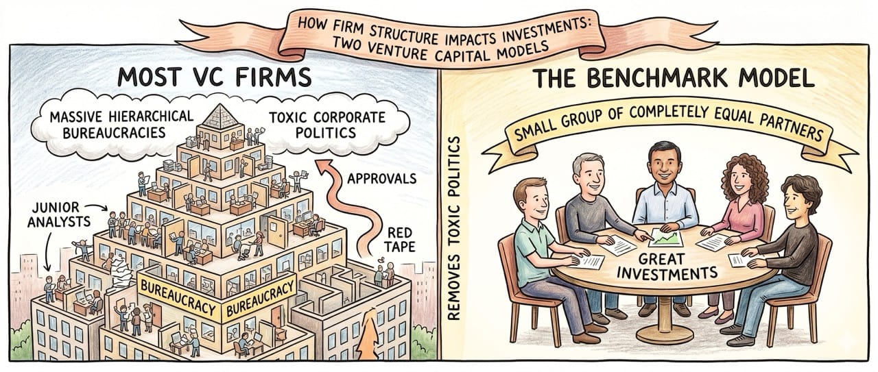 Most venture capital firms operate as massive hierarchical bureaucracies with hundreds of junior analysts.