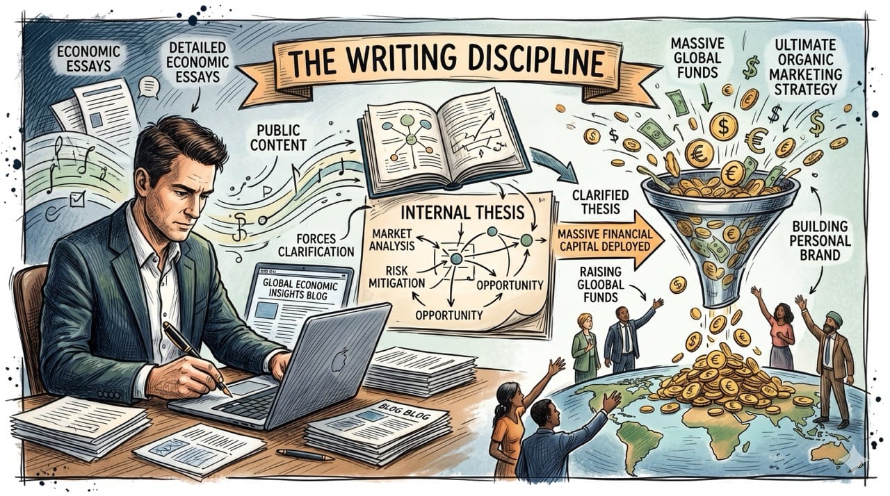He built his massive personal brand by writing incredibly detailed economic essays on his famous public blog.