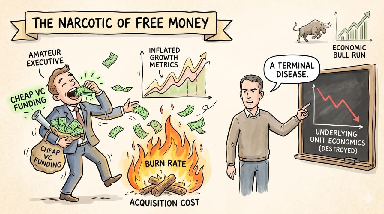 Cheap capital acts as a dangerous narcotic that completely masks fundamentally flawed business models. The ultimate executive survives economic winters by building structural moats rather than burning cash.
