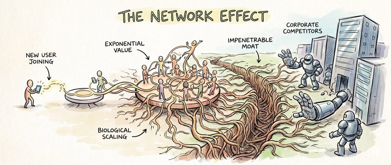 A true network effect occurs when a product becomes exponentially more valuable as every single new user joins the platform.