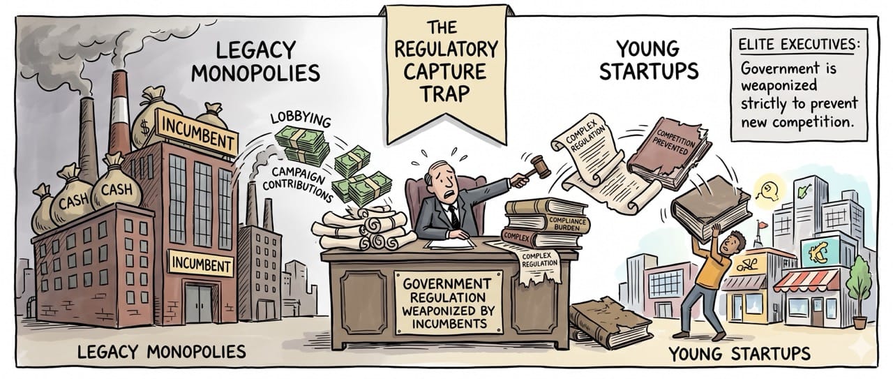 Elite executives must understand that government regulation is frequently weaponized by incumbents strictly to prevent new competition.
