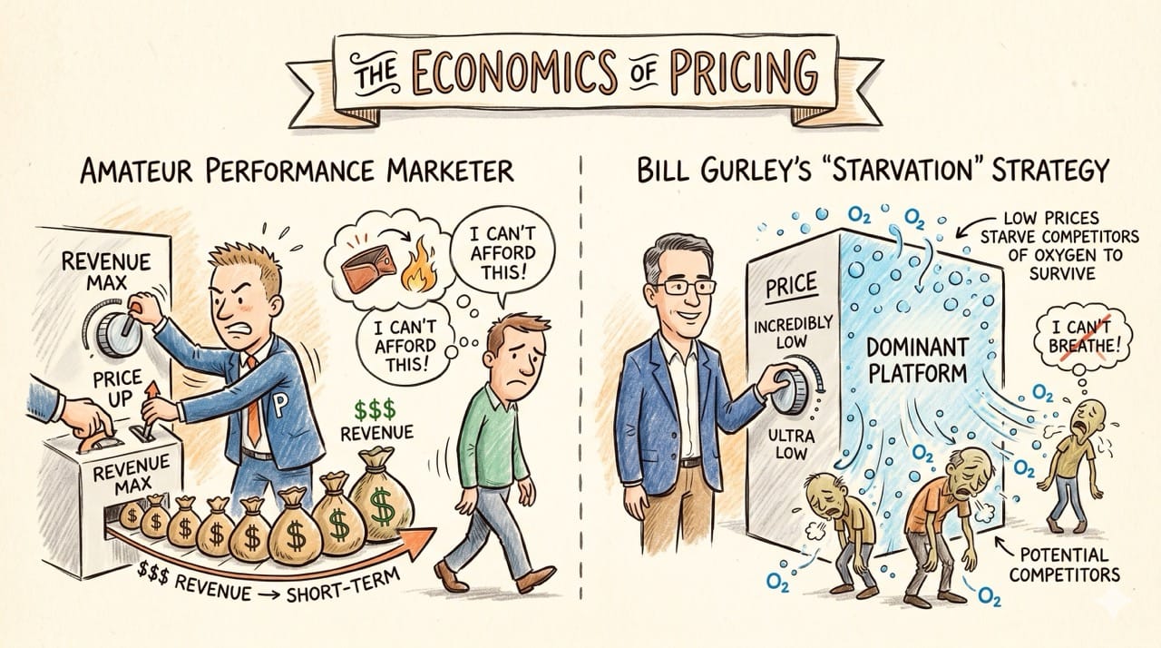 Gurley famously advocates for the exact opposite strategy when a company possesses a massive structural advantage.